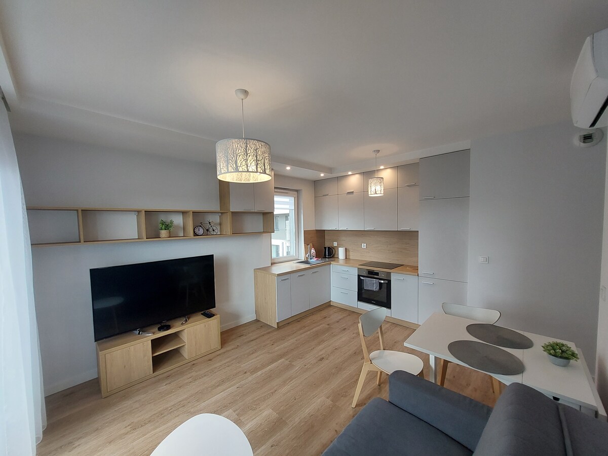 Isang moderno at komportableng apartment na matatagpuan sa ika -11 palapag sa isang gusali na matatagpuan sa promenade sa Lagoon, sa complex ng mga gusali na Panorama Kwiatkowski sa Rzeszów. Ang lokasyon ng apartment ay nagbibigay ng isang natatanging pagkakataon upang kumonekta sa kalikasan na malapit sa sentro ng lungsod, hindi malayo sa Rzeszów Boulevards. Makakapagpahinga rito, puwede mong gamitin ang beach, pier, boardwalk, bisikleta at mga daanan sa paglalakad, palaruan, pati na rin ang mga tindahan at restawran.
