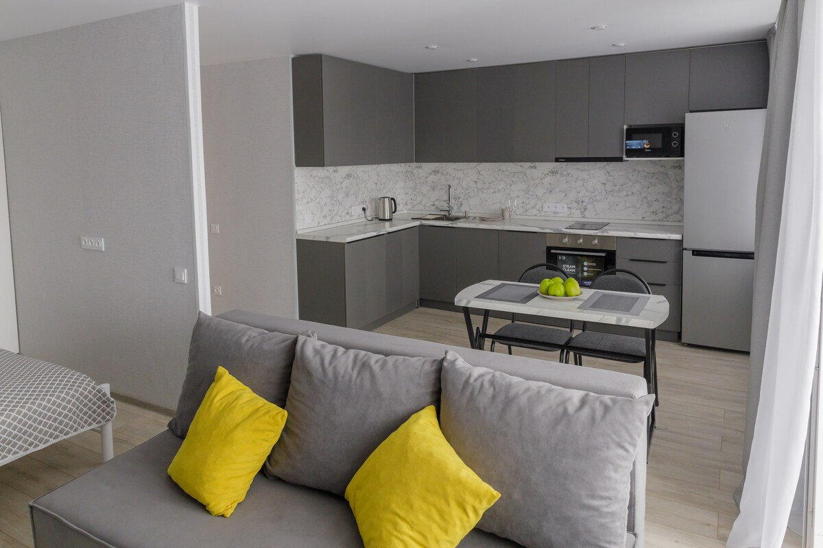 Inuupahan ang studio pagkatapos ng malaking pagkukumpuni para sa 1 -2 tao. Sa iyong serbisyo: *Mga bathrobe *Mga tsinelas * Mga toothbrush *SMART TV *WiFi *Komportableng higaan na may Askona orthopedic mattress *Rain Shower *Magandang tanawin mula sa ika -9 na palapag *Electronic lock (Walang pakikisalamuha sa pag - check in) *Iron *Hair dryer *Washing machine *hob *Oven Matatagpuan ang mga apartment sa sentro ng lungsod. Malapit lang ang mga shopping mall, sinehan, cafe, at restawran. Maginhawang palitan ng transportasyon.