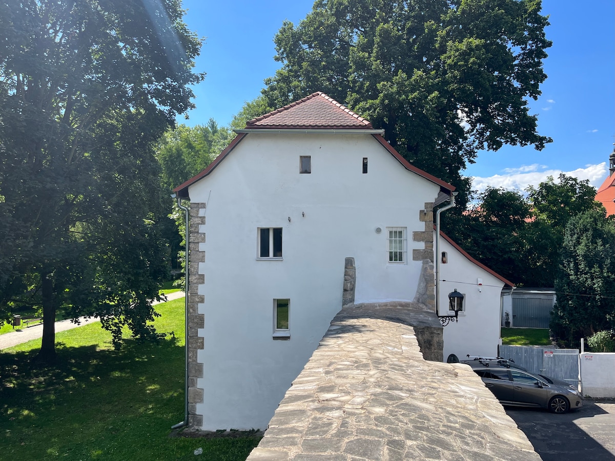Every fragment of the turret, every room is a blend of history, old materials, and the medieval spirit with design and comfort. Here, nothing is perfect... no right angles, no obvious spaces. There is plenty of stone, wooden floors, old restored windows, a wooden staircase in the center of the house reminding you of the age of the home. There are cobwebs that appear out of nowhere. There is a soul. The bathroom, which invites you to bathe in an old cast iron tub, and a sauna...