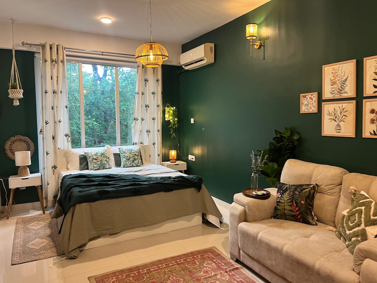 Maginhawang studio na may temang tropikal sa gitna ng Vagator, isang maikling lakad lang papunta sa beach, Hilltop, Friday Night Market at mga nangungunang club tulad ng Romeo Lane & Mango tree restaurant. Naka - istilong may mga halaman at earthy tone, nagtatampok ito ng double bed, sofa at Smart TV, dining area, kumpletong kusina at modernong banyo. Masisiyahan ang mga bisita sa high - speed na Wi - Fi, pool at gym access, paradahan para sa mga kotse at bisikleta, 24/7 na seguridad at backup ng kuryente. Perpekto para sa mga mag - asawa, solong biyahero o kaibigan.