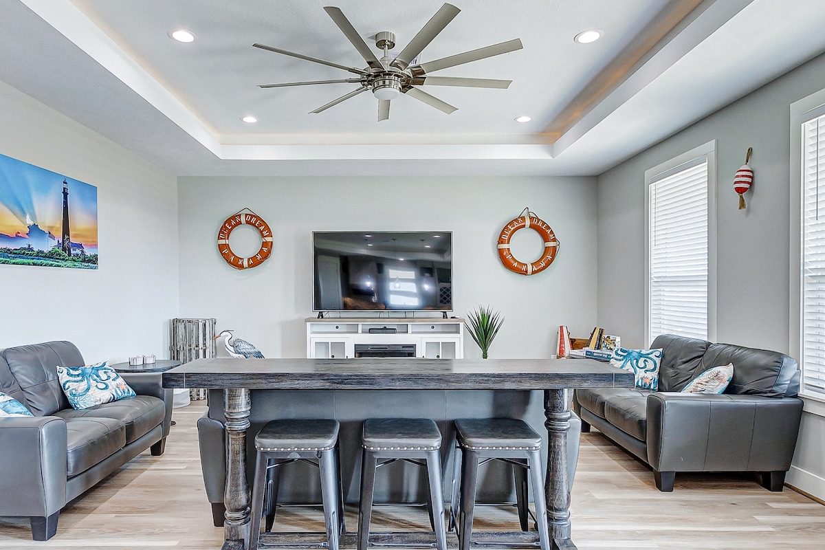 Crisp! Clean! Bright! This beauty was recently remodeled and feels like new. 2 minute walk to the beach, take the house golf cart (free!), or drive a few seconds. Groceries are very close too. Close enough to town to experience the attractions like a water park, boardwalk amusement park, museums, water sports, nature, boating, or bay and gulf fishing. House has great open floor plan with lots of room, and roomy bedrooms. House includes a golf cart! $150 a day value...no cost!