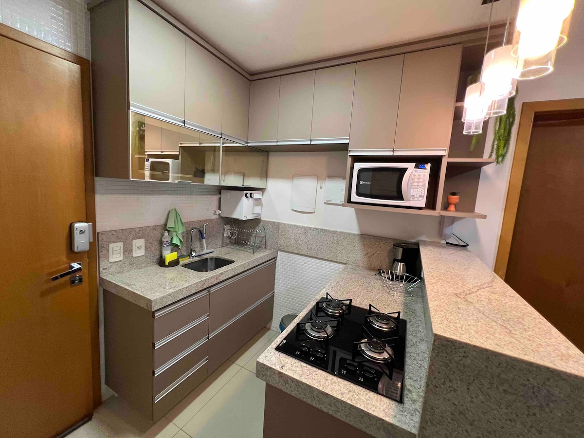Natatangi at maaliwalas na apartment!!! May 1 silid - tulugan, 1 queen bed, kumpletong kagamitan, mahusay na lokasyon, na may wifi, 2 Smart TV, mga kasangkapan tulad ng microwave, coffee maker, filter na may yelo na tubig, bakal, hair dryer.. mga bed and bath linen at pribadong garahe. Ang lugar ng paglilibang na kumpleto sa pinainit na pool, sauna, jacuzzi, gym, labahan, at sa mall ay may mga mahusay na restawran at coffee shop. Bukod sa pinakamagandang shopping mall sa Goiás, Flamboyant Shopping.