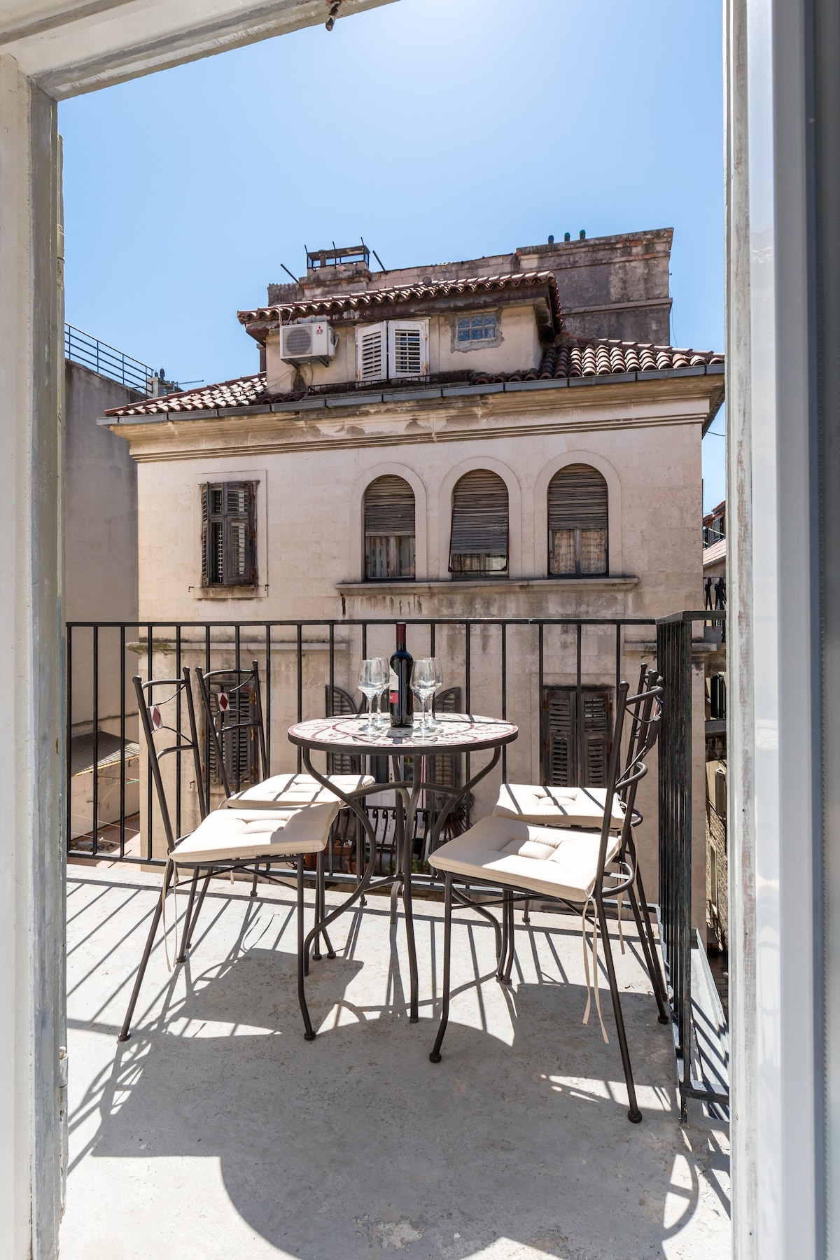 Gumising sa ilalim ng mga nakalantad na bitayan ng mga daang taong gulang na kahoy na kisame. Mabighani sa mga antigong detalye, hagdang may estilong industrial, at magagandang finish na matatagpuan sa likod ng malalawak at malalaking arko na gawa sa bato sa loob ng Imperial Palace na pinoprotektahan ng UNESCO. Uminom ng wine sa balkonahe ng natatanging loft na ito na may makasaysayang dating pagkatapos galugarin ang mga kagandahan ng Split, kung saan may mga piraso ng museo na nakapalamuti sa kulay ng buhangin at mga kulay na earthy.