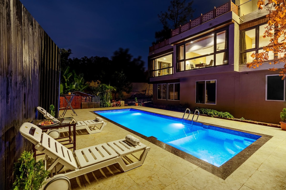 Luxury 6BHK villa na may mga tanawin ng bundok, sariwang hangin, at pribadong pool — perpekto para sa mga bakasyunan ng pamilya o mga kaganapan sa pagho - host. Nagtatampok ng maluluwag na lounge, eleganteng silid - tulugan na may mga balkonahe, kumpletong kusina, smart TV, Wi - Fi, at araw - araw na housekeeping. Masiyahan sa panlabas na kainan, maaliwalas na hardin, at tahimik na kapaligiran. Mainam para sa mga pagdiriwang o mapayapang pagtakas, ilang minuto lang mula sa mga magagandang daanan at lokal na atraksyon. Isang perpektong timpla ng kalikasan, kaginhawaan, at estilo.