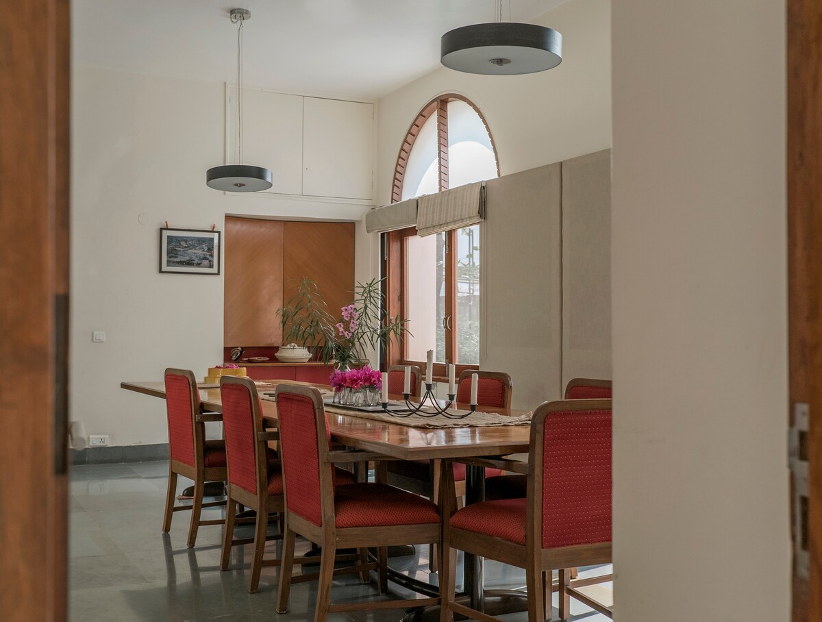 House of a thrid generation army officer we simply believe in upholding our tradition to it's utmost value. The bunglow has 5 rooms in which 2 rooms also constitute as a studio apartment as well if needed. The bunglow is located in serene and a calm enviornment located in a peaceful area with classic aravalli mountain view. The spacious drawing room withs fire place and beautiful curved high ceiling will take you back to the 18th century vintage army bunglow.