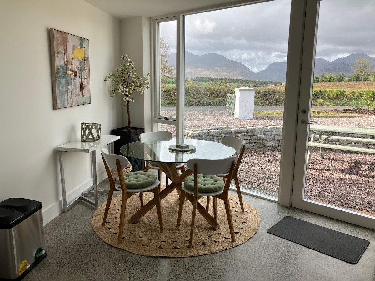 Ang Mga Tanawin, Ang Mga Tanawin, Ang Mga Tanawin!!! Bago para sa Tag - init , ang bagong itinayong property na ito ay isang naka - istilong apartment na may isang kuwarto na matatagpuan sa sikat sa buong mundo na Ring of Kerry. Ipinagmamalaki nito ang mga nakamamanghang tanawin ng Macgillycuddy Reeks Mountain Range. Naglalaman ang marangyang apartment na ito ng marangyang apartment na ito na may kumpletong kusina, double bed, ensuite bathroom na may shower, na may maluwag na open plan living room area. Nagho - host ito ng panlabas na balkonahe para sa kainan sa Al Fresco o simpleng pagtingin sa magandang tanawin.