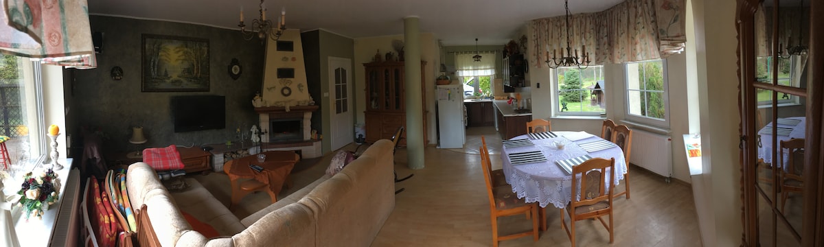 Inaanyayahan ka namin sa isang bahay na buong taon, na matatagpuan sa ilalim ng kagubatan sa gitna ng Kasubia. Ito ay isang perpektong lugar upang makapagpahinga mula sa ingay ng lungsod at makapag-relax. Ang magandang kapaligiran ay maganda para sa paglalakad at pagbibisikleta. Sa bahay, nagpapaupa kami ng dalawang silid-tulugan sa itaas na palapag at sa unang palapag, nagbibigay kami ng kusina, banyo, silid-kainan na may TV at fireplace, at may bubong na terasa. Mula sa terrace, may tanawin ng mga pastulan, gubat at lawa.