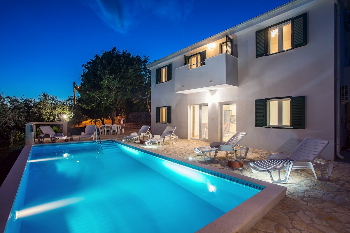 Ang aming bagong luxury villa Luka ay matatagpuan sa isang kahanga - hangang lokasyon na may magagandang tanawin at napakalapit pa rin sa lahat ng mga lokal na punto ng interes. Bagong gawa ang villa para sa maximum na kaginhawaan at karangyaan na may 3 ensuite na kuwarto (at dagdag na kuwarto sakaling kailanganin) at lahat ng iba pang amenidad na maaari mong kailanganin. Isang malaking pribado at pinainit na pool na may magagandang tanawin, magandang indoor jacuzzi sa spa area na may sauna at gaming/billiard room, magandang bakod na outdoor area na may table tennis, badminton o archery set.