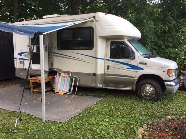 Mayroon kaming 22 talampakang motorhome na nakaparada sa ilalim ng mga puno ng lilim sa aming bakuran. May bakod sa privacy sa pagitan ng kapitbahay. Ang awning ay naka - set up para sa lilim at kanlungan mula sa ulan at mga tapiserya para sa dagdag na privacy na may labas na mesa at mga upuan na magagamit mo. Sa loob ay natutulog hanggang 4 na maaaring medyo makitid kung ikaw ay matataas na tao. Kusina, banyo, couch/kama, mesa/higaan, A/C, Heat, tubig, kuryente. Karamihan sa lahat ng bagay sa bayan ay nasa loob ng 5 - 10 milya. lakad.