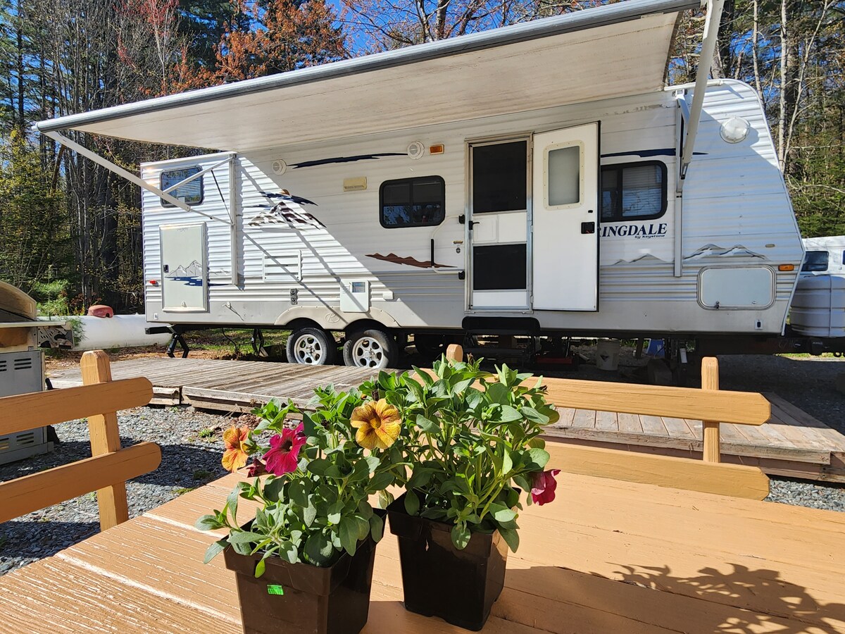 Masiyahan sa isang bakasyon na makakatulong sa iyo na makatakas nang ilang sandali mula sa lahat ng kaguluhan at abala. Mamalagi sa aming komportableng camper para makapagpahinga at makapagpabata. Magkakaroon ka ng access sa isang grill, isang fire pit, at ang aming naka - screen na gazebo. Subukan ang aming mga larong damuhan, tulad ng butas ng mais at mga tapal ng kabayo. Mainam ito para sa bakasyon sa katapusan ng linggo ng mag - asawa! Puwede kang bumisita sa magandang Montpelier, kabisera ng estado, o makasaysayang Stowe, Vermont. O bumiyahe nang isang araw sa Ben & Jerry's, Cabot Cheese Factory, Cold Hollow Cider o panoorin ang sining ng pamumulaklak ng salamin!