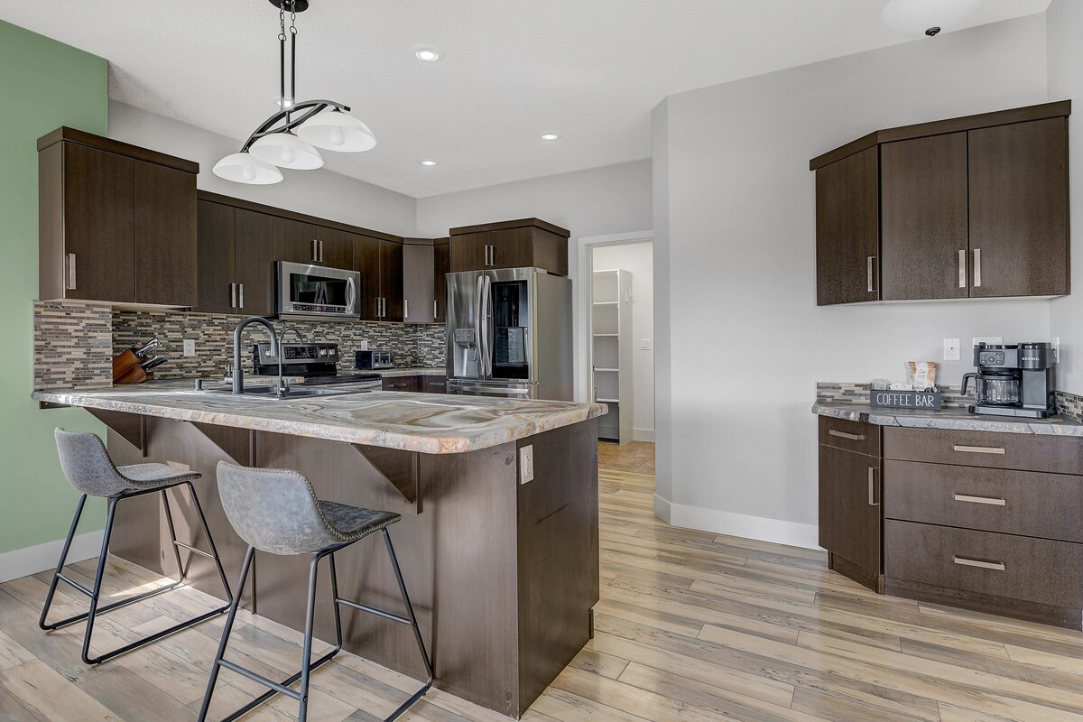 Ang naka - istilong lugar na matutuluyan na ito ay perpekto para sa mga biyahe sa grupo. Walking distance sa grocery store at mga restaurant. Nasa tuluyang ito na mainam para sa alagang hayop ang lahat ng kailangan mo. Kumpleto ang kagamitan, maliwanag at maluwang! Ang lugar na ito ay may apat na silid - tulugan na lahat ay may mga queen bed, dalawang paliguan at dalawang buong sala. Ginagawa nitong perpektong lugar para sa mga pamilya ang tuluyang ito. Kasama sa bahay na ito ang malaking paradahan para sa dalawang malalaking sasakyan, malaking likod - bahay at BBQ deck space. Puwedeng matulog nang may kabuuang 9 na taong may pull - out na couch.