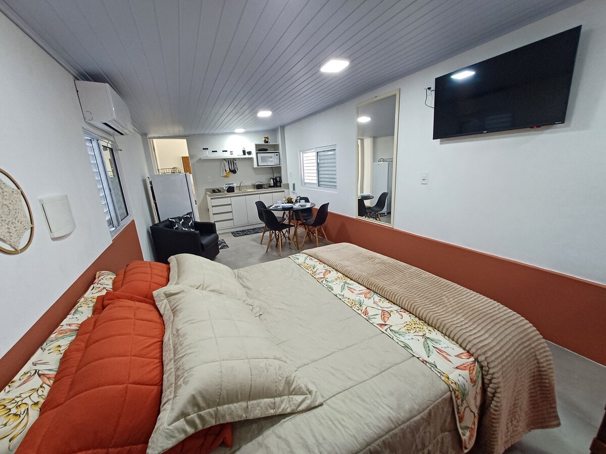 A 5 minutos das banheiras de águas termais, o Aurora Loft é aconchegante e equipado. Oferecemos roupas de cama e toalhas impecáveis, trocadas a cada estadia. A cozinha conta com micro-ondas, frigobar, sanduicheira, cafeteria, chaleira elétrica e utensílios, exceto fogão. No exterior, um jardim iluminado oferece pergolado, lounge e churrasqueira, perfeitos para relaxar. O terreno é fechado e seguro. Momentos inesquecíveis esperam por você!