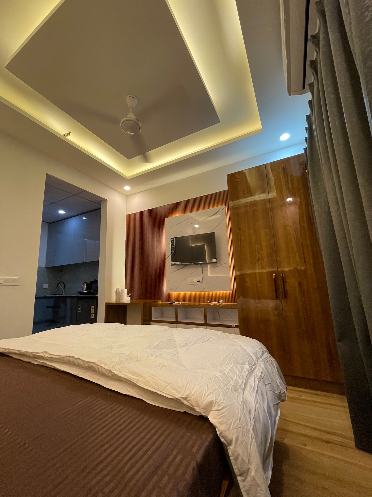 Kick back & relax in this calm & luxurious studio with the warmth of home & the vibe of a high-end hotel. Furnished with a plush King-size bed & modern décor. Amenities: 24/7 Grocery Store Modern Kitchenette High-Speed WiFi & TV Secure Parking outside tower but 24/7 Secured The first 2 floors has commercial shops, offering: Laundry Services Salon Café Medical Store Easy access to the India Expo Mart, Buddh International Circuit. Perfect for couples, solo travellers, or business partners.