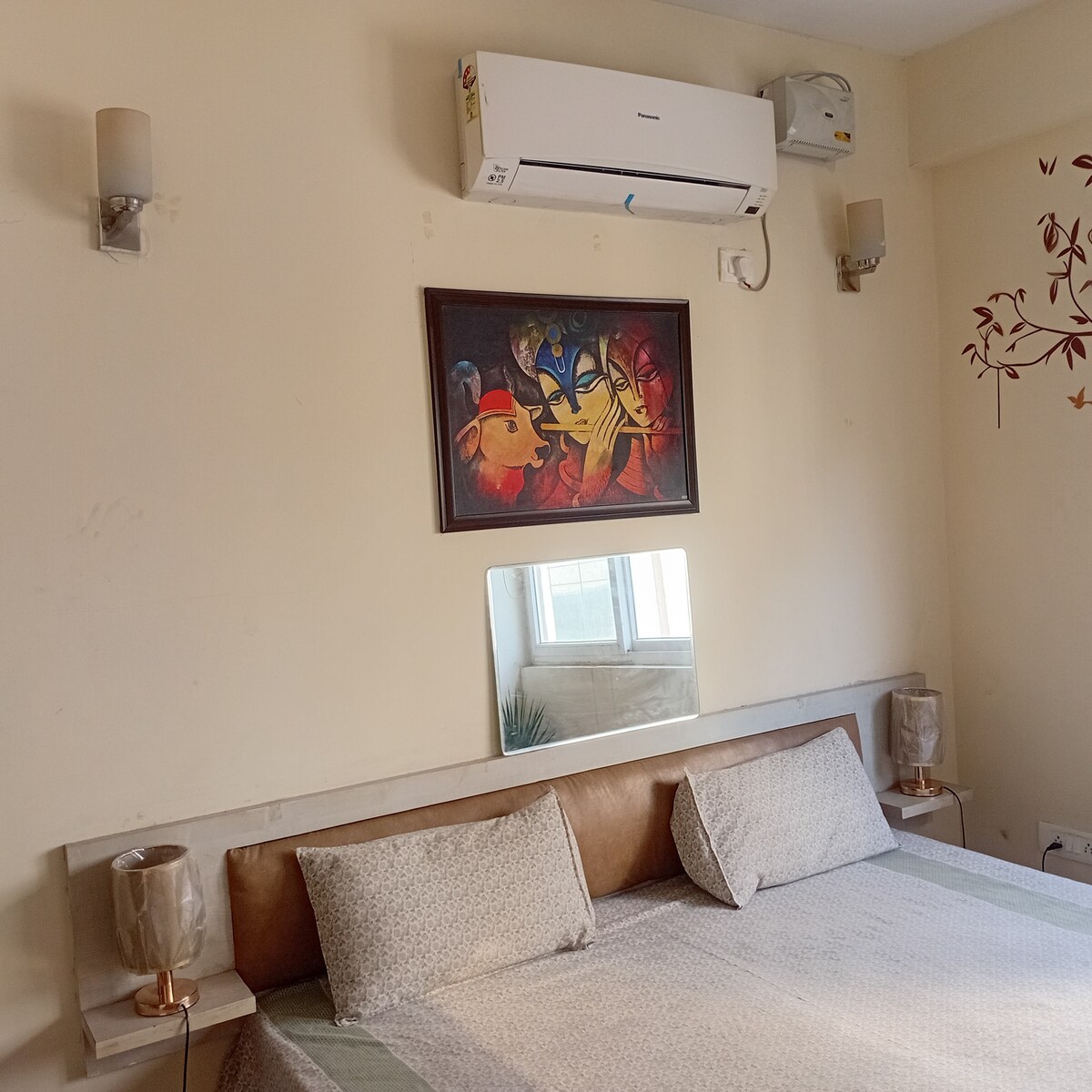 Kick back & relax in this calm & luxurious studio with the warmth of home & the vibe of a high-end hotel. Furnished with a plush Queen-size bed & modern décor. Amenities: 24/7 Grocery Store Modern Kitchenette High-Speed WiFi & TV Secure Parking outside tower but 24/7 Secured The first 2 floors has commercial shops, offering: Laundry Services Salon Café Medical Store Easy access to the India Expo Mart, Buddh International Circuit. Perfect for couples, solo travellers, or business partners.