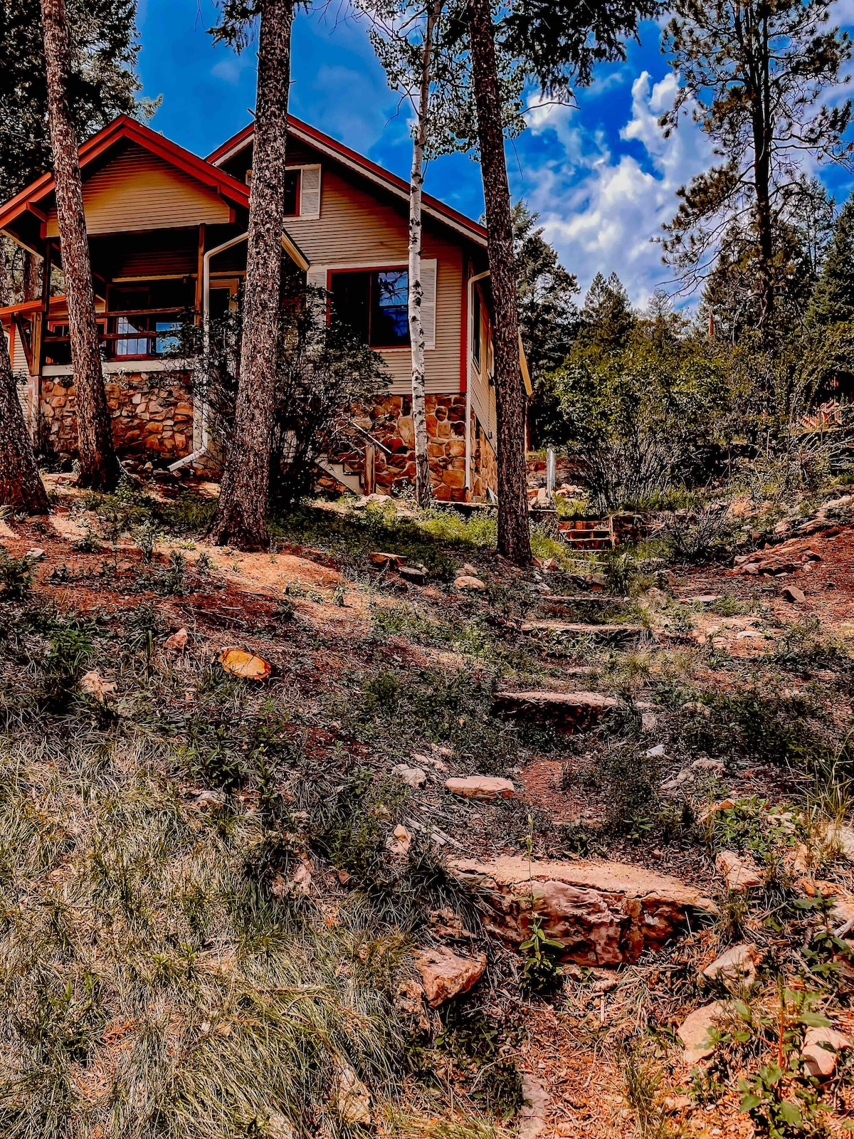Hindi na kailangang maglakbay sa aparador para mahanap ang mahiwagang destinasyong ito! Tangkilikin ang sariwang hangin sa bundok na nakatago sa gitna ng mga puno ng pine at aspen. Maglakad hanggang sa mga talon o patuloy na mag - hiking hanggang sa Pikes Peak! Kung gusto mo lang mag - enjoy sa isang tamad na araw, umupo at magrelaks sa front deck o back porch at mag - enjoy sa kalikasan sa pinakamasasarap nito! Tangkilikin ang rustic na kasaysayan pati na rin ang lahat ng mga nilalang na ginhawa. Ang Narnia on Pikes Peak ay lalong nilikha bilang isang retreat ng mga artist at manunulat at bakasyon ng mag - asawa.