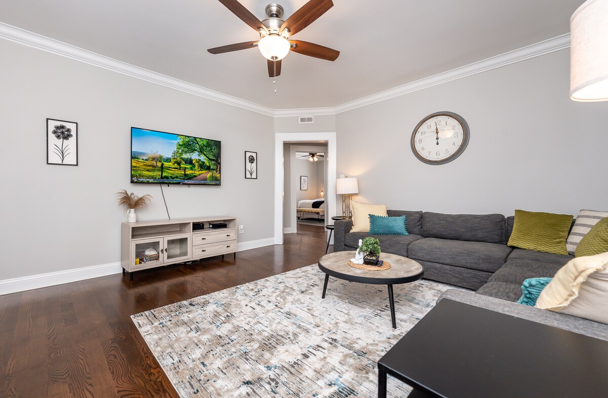 Damhin ang kagandahan ng aming maganda at maaliwalas na apartment, 0.01 milya (4 na minutong lakad) lang ang layo mula sa Bon Secours Wellness Arena. Narito ka man para sa isang konsyerto, kaganapan, o para tuklasin ang masiglang lungsod ng Greenville, ang aming komportableng bakasyunan ay ang perpektong batayan para sa iyong mga paglalakbay. Masiyahan sa mainit na kapaligiran na may naka - istilong dekorasyon, malawak na sala, at kusinang kumpleto ang kagamitan. Nagtatampok ang tuluyan ng dalawang komportableng silid - tulugan para sa maayos na pagtulog sa gabi, na tinitiyak na nararamdaman mong komportable ka.