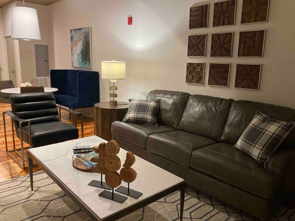 Kung naghahanap ka ng karanasan sa unang klase ng Greenville, ito ang tuluyan para sa iyo. Ang kamangha - manghang Main st. facing unit na ito ay may malaking balkonahe na may mga magkasalungat na sofa para sa iyo na magbabad sa karanasan sa downtown. Ang buong unit ay binago noong 2019 at may mga bagong kagamitan. Isa itong studio unit na may ganap na bukas na floorplan. Ipinagmamalaki ng bedroom area ang King size bed na may marangyang bedding. Ang studio na ito ay maaaring matulog ng 2 dagdag na bisita pati na rin ang queen size sleeper sofa nito. Napakagitna nito!