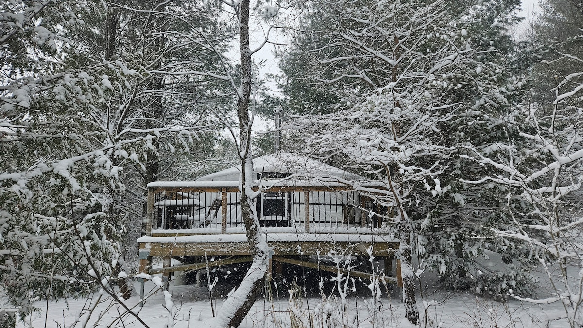 Mamalagi sa yurt ng ReLive Retreat sa Ontario sa apat na panahon. Isang Mongolian yurt ang Juniper na nasa tahimik at pribadong bakasyunan sa kalikasan na mainam para sa mga mag‑asawa at solo na biyahero. Puwede ring mag‑alaga ng aso. Maaliwalas na 16' na bilog na tuluyan na may wood-burning stove + propane heat, queen bed + single fold-out, kusinang may spring water, nakakabit na half bath (compost toilet), pribadong deck at fire-pit, at shared wood-fired sauna + 3-season shower. Matatagpuan sa pribado at tahimik na 72‑acre na property na napapaligiran ng kagubatan at mga hayop.