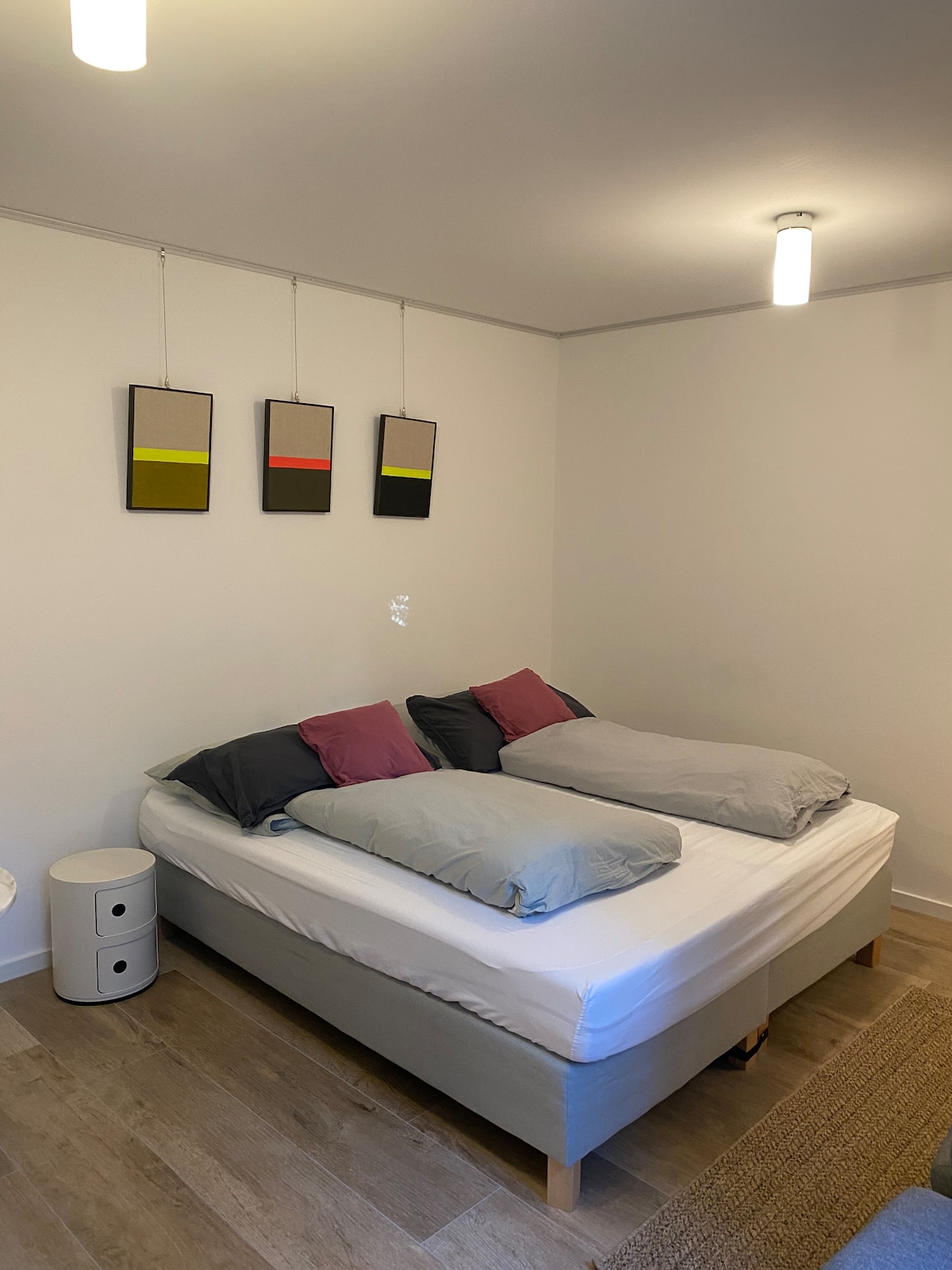 Ang apartment ay ginawa na may maraming pag - ibig sa detalye. Sa hall way ay may gallery ng Munich Olympics 1972. Sa sala sa kusina, hindi ka lang puwedeng magluto, kundi puwede ka ring umupo nang komportable. Nasa gitna ng apartment ang sala - na may magandang tanawin ng malaking hardin. Ang apartment ay may 2 double bedroom na may workspace. Bukod pa sa bathtub, may hiwalay na toilet na available.