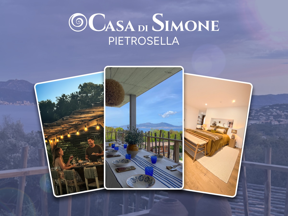 Modernong single - storey villa na 120 sqm, perpekto para sa mga holiday kasama ang pamilya o mga kaibigan sa isang tahimik at tahimik na kapaligiran. Binubuo ang villa ng 3 silid - tulugan na may banyo/tubig, kusina/sala sa sala kung saan matatanaw ang terrace na may pool, fire pit at muwebles sa hardin. Mula sa terrace magkakaroon ka ng tanawin ng mga nakapaligid na ubasan at bundok. Mga linen ng higaan, tuwalya Magandang lokasyon na 3 minuto lang ang layo sa sentro ng lungsod, mga beach, at pier kung saan sasakay ng shuttle papunta sa Ajaccio.