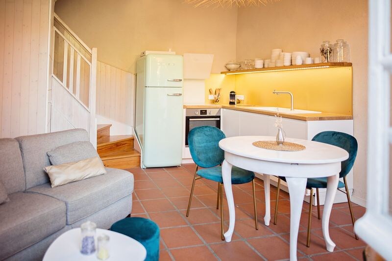 Studio neuf et moderne , prénommé le sans soucis , une terrasse en bois. Vue sur la campagne avec transat,table de jardin barbecue. Kitchenette équipée (cafetière ,bouilloire,grille-pain,plaques inductions frigo ,service à raclette deux personnes,)salle de bain avec douche. Un lit deux places , un canapé lit BZ beige ,Petit village calme , situé 10 min des plages en voiture.