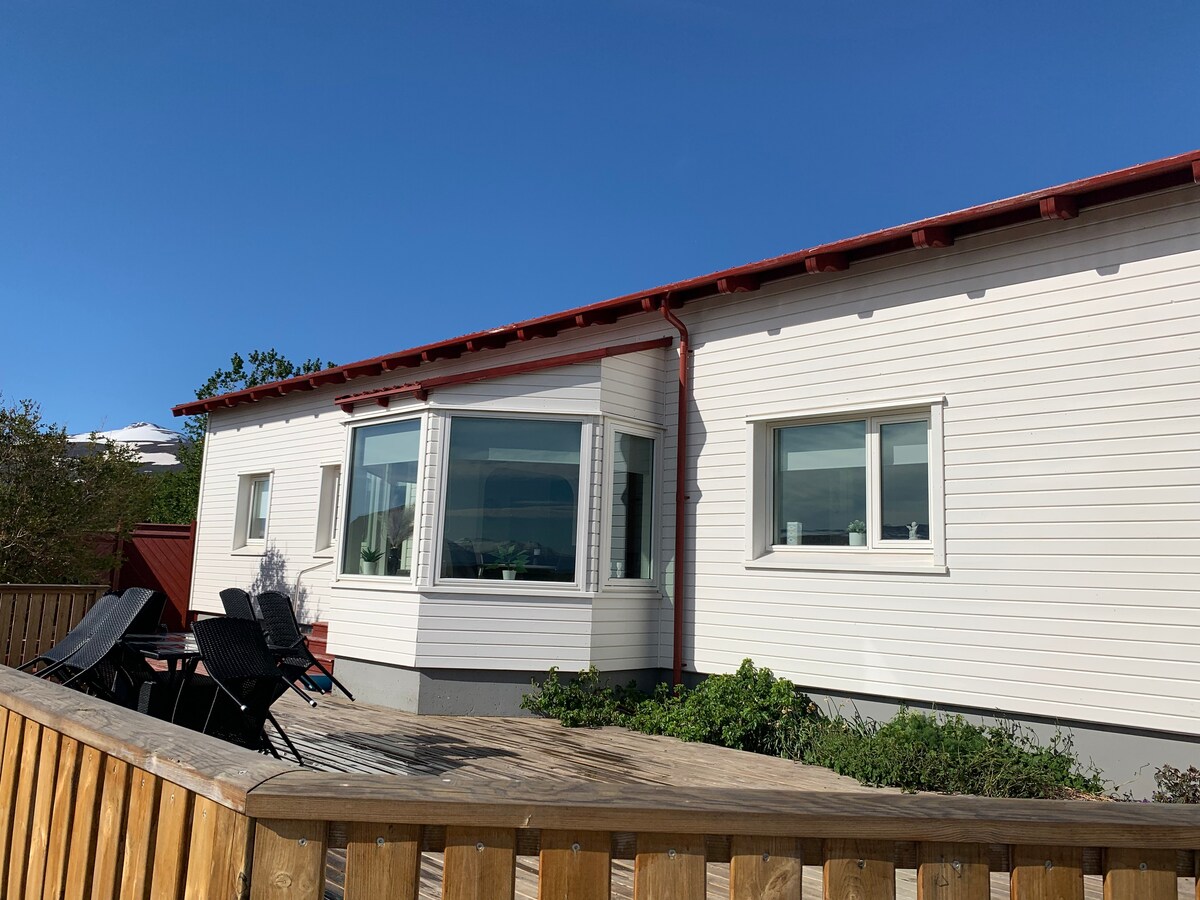 Itinayo noong 1926, ang isang magandang bahay sa Grenivík, isang kalmadong family - friendly township sa North Iceland. Matatagpuan ito sa mga ugat ng burol ng Höfði, malapit sa baybayin, na may nakamamanghang tanawin ng fjord. Maraming maiaalok ang kalikasan sa lugar, tulad ng mga pana - panahong aktibidad kabilang ang mga walking trail, hiking, berry picking, horseback riding, snowmobiling, at skiing. Mga lugar na malapit sa: Akureyri 25 min.Goðafoss, 30 min., Myvatn 55 min. at Húsavík 55 min. na biyahe ang layo.