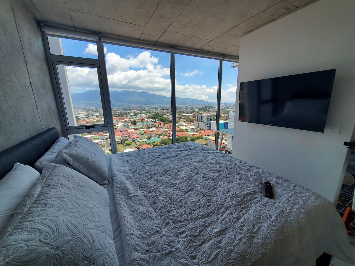 Studio Apartment sa ika -18 palapag. Mapayapa at sentrong lugar. KING SIZE BED NA MAY MAGANDANG TANAWIN ng mga bundok. Malapit ang apartment sa mga supermarket, shopping mall, restawran, at cafeteria. Matatagpuan sa isang maganda at magarbong kapitbahayan. Malapit sa mga hintuan ng bus at San Jose Metro - Area Mabilis na pagsakay sa Uber. ** * Walang usok ang gusaling ito, kaya hindi pinapayagang manigarilyo sa anumang lokasyon o sa apartment ***