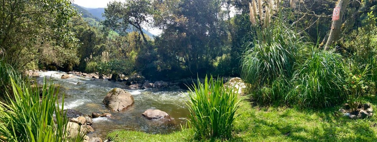Isa itong pribadong rustikong retreat na napapaligiran ng kalikasan, na idinisenyo para sa mga gustong makapagpahinga at makapagpahinga. Matatagpuan 15 minuto mula sa Gualaceo at 1 oras mula sa Cuenca. Pinagsasama‑sama ng cabin ang kahoy, malalawak na espasyo, at natural na liwanag, na may kumpletong kusina at sala na may fireplace. Sa labas, may malaking hardin, pergola na may mga duyan, mga laruan ng mga bata, barbecue, at access sa pribadong beach sa tabi‑bang ng ilog. Mainam para sa mga pamilya, bakasyon sa katapusan ng linggo para magpahinga at magrelaks, at marami pang iba.