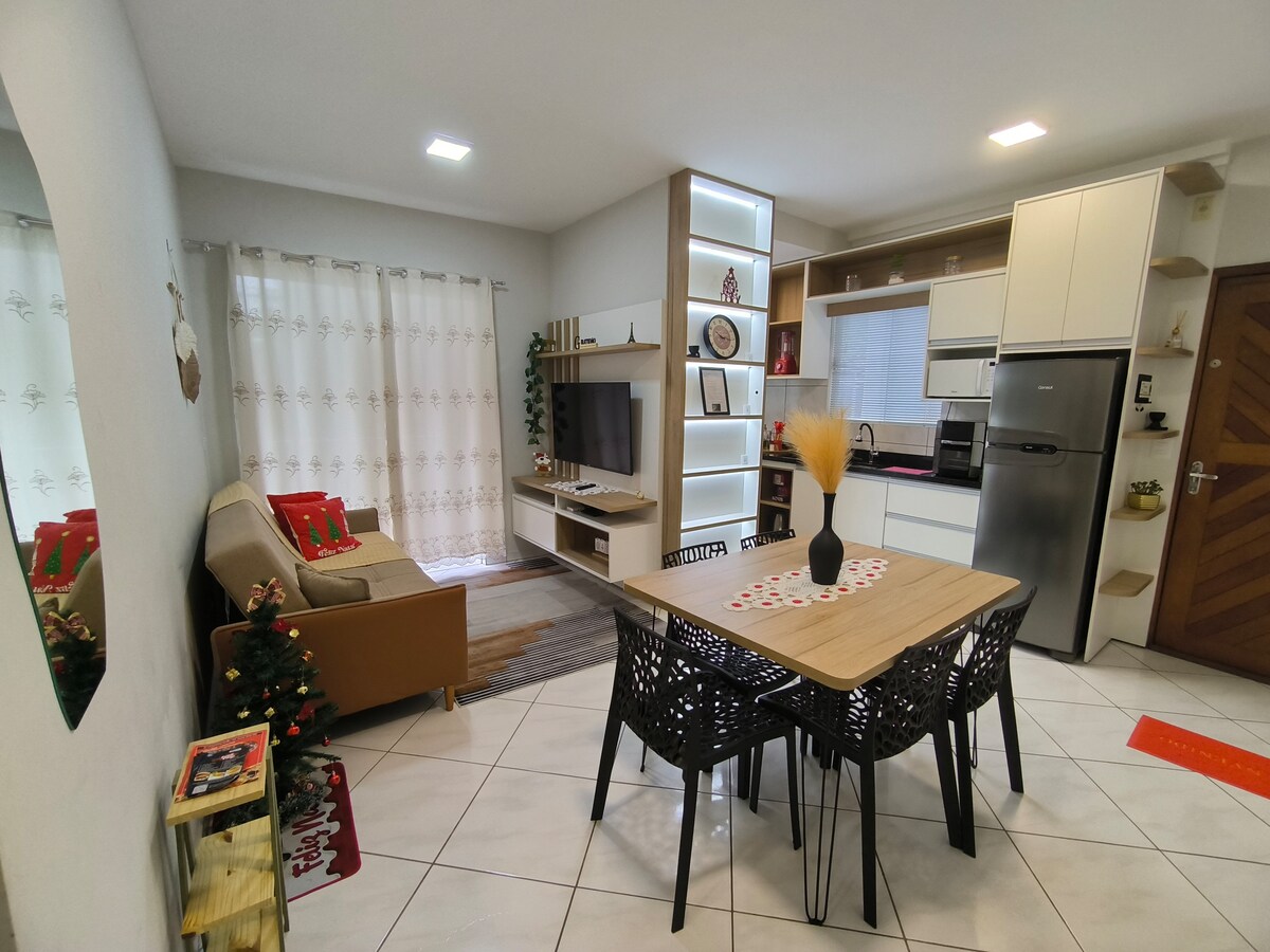 Pribado ang ap, ibig sabihin, hindi mo ibinabahagi sa iba sa labas ng iyong reserbasyon, mayroon itong 2 kuwarto, ngunit para sa mga reserbasyon hanggang sa 2 tao ay 1 kuwarto lamang ang bukas, ito ay matatagpuan sa tabi ng Via Verde, malapit sa Weg, Bold, Elian, Live, Lunelli…ito ay 5 minuto mula sa downtown. Nag - aalok kami ng isang tuwalya sa paliguan kada bisita. Mag‑enjoy sa kumpleto, tahimik, komportable, malinis, at magandang lokasyon na tuluyan na ito.