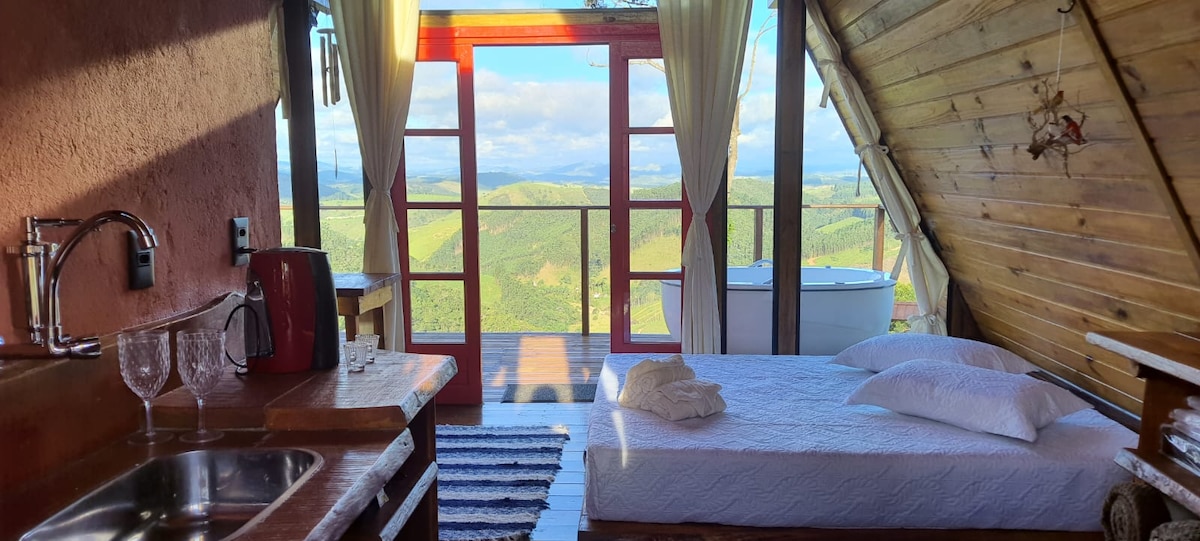 Descubra o encanto da Serra da Mantiqueira nesta cabana projetada para que você possa contemplar o nascer do sol sem sair da cama. Venha relaxar em nosso spa aquecido, observar as estrelas na rede suspensa e balanço. A cabana possui um quarto integrado com uma aconchegante cama Queen. Na sala/cozinha, um futon super confortável acomoda mais dois hóspedes, tornando a experiência ideal para famílias. A propriedade também conta com trilhas e pequenas quedas d'água.