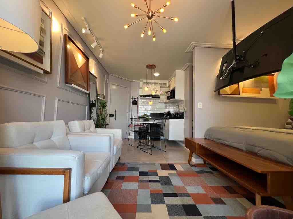 Ang Elegance at magandang panlasa ay ang perpektong kumbinasyon ng kapaligiran na ito. Matatagpuan sa mataas na palapag na may maraming ilaw, ang panukala ay para sa isang natatanging pamamalagi! May kapasidad para sa 4 na bisita, ang studio ay may queen size bed at sofa bed. Sarado ang balkonahe na may salamin, may barbecue at magandang lugar para kumain. Ang kusina ay mahusay na nilagyan ng mahusay na oven at mga high - end na kasangkapan. O Studio tem ar conditioning at uma lava at dry machine.