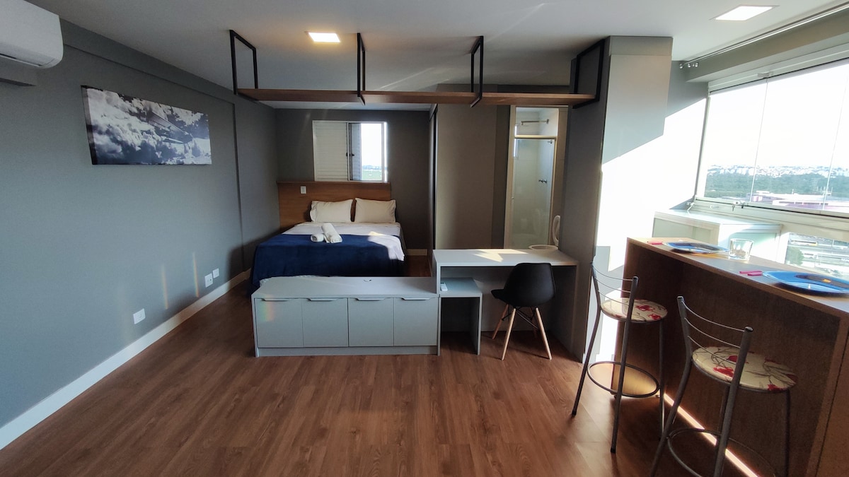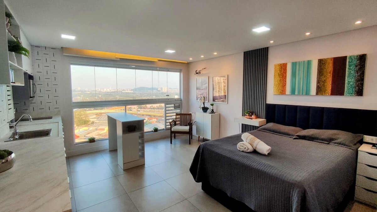 Yakapin ang iyong Studio na may Magandang Tanawin na malapit sa paliparan nang may lahat ng kaginhawaan at kaginhawaan ng iyong tuluyan, na may magandang dekorasyon na idinisenyo para sa mga panandaliang pamamalagi o pangmatagalang pamamalagi Perpekto para sa mga mag - asawa, mga taong bumibiyahe nang mag - isa para sa paglilibang/trabaho. Istruktura para sa hanggang 2 tao (queen bed). Mercados, Pharmacy, panaderya, malapit. Para sa mga darating sakay ng kotse, may bakante kami =) Studio na 11 minutong biyahe sakay ng kotse mula sa Guarulhos international airport - GRU