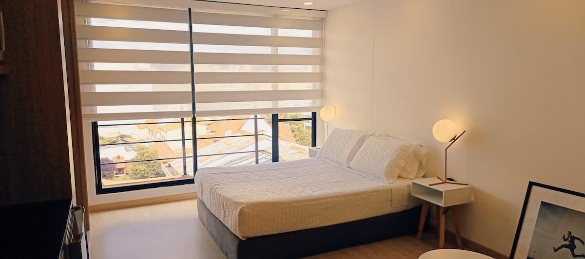 Maligayang pagdating sa aming magandang suite. Sa pamamagitan ng moderno at komportableng disenyo, nag - aalok ito ng mga nakamamanghang tanawin ng mga burol sa silangan. Masiyahan sa isang gym na may kumpletong kagamitan at isang kamangha - manghang rooftop na may BBQ, na perpekto para sa iyong mga nakakarelaks na sandali. Bukod pa rito, mayroon itong pribadong paradahan para sa iyong kaginhawaan. Napapalibutan ng mga lokal na restawran, parke, at tindahan. Matatapon ka sa pampublikong transportasyon. Perpekto para sa mga bakasyunan o business trip. Magpareserba ngayon at magkaroon ng hindi malilimutang karanasan sa Bogotá!