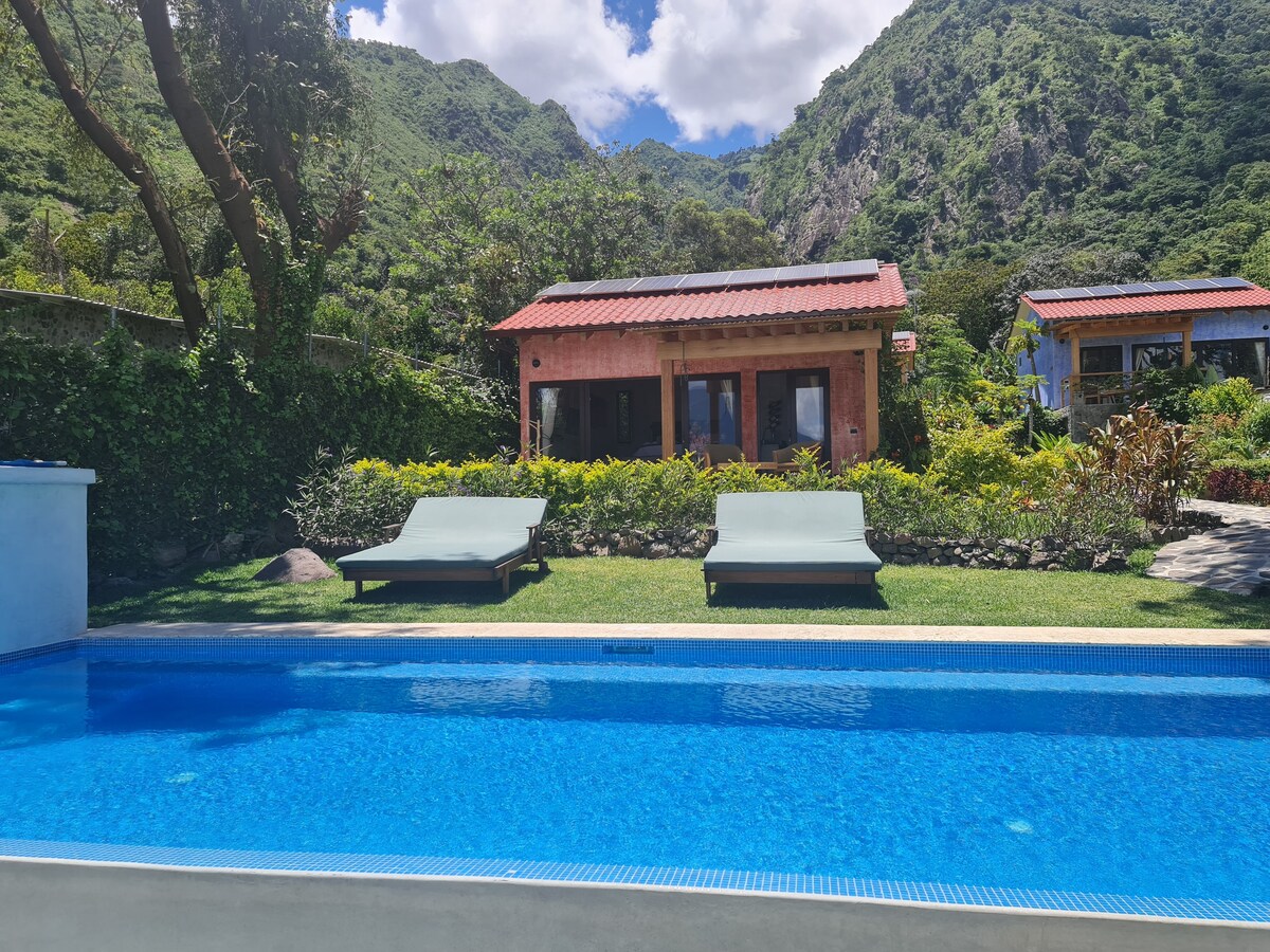 Ang natatanging dinisenyo na tuluyan ay may maliwanag at maaliwalas na floor plan, na may 2 built - in na king - sized na kama (kasama ang isang solong), isang fireplace, isang lounge area na doble bilang karagdagang espasyo sa pagtulog (pinakamahusay para sa mga bata), isang kumpletong kusina, isang buong paliguan na nagtatampok ng dalawang tao na soaking tub, isang dining area, at isang 10 metro ang haba na patyo na may isang day bed, duyan at lugar ng upuan. Siyempre, ang lahat ng kuwarto ay may mga kamangha - manghang tanawin ng lawa at ang marilag na bulkan kung saan kilala ang Lake Atitlan.