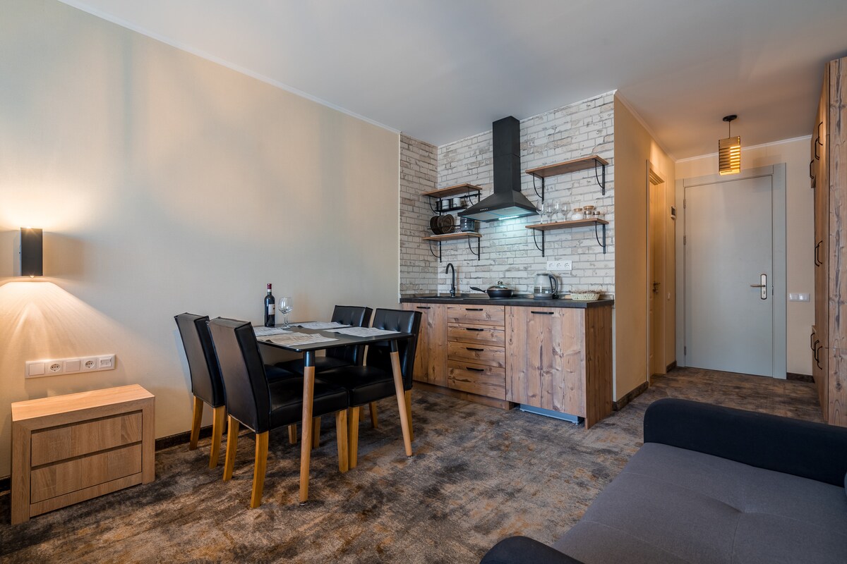- Chemia Studio in Gudauri - has an unique Industrial style, designed by "Chemia Studio". Duplex apartment is made all handmade, with natural wooden, brick and steel materials. - Chemia Studio in Gudauri - offers an unique atmosphere with an enjoyable Hot tub for post skiing relaxation. Duplex entertainments include: 1. movie projector for movie nights; 2. Playstation 5 pro.
