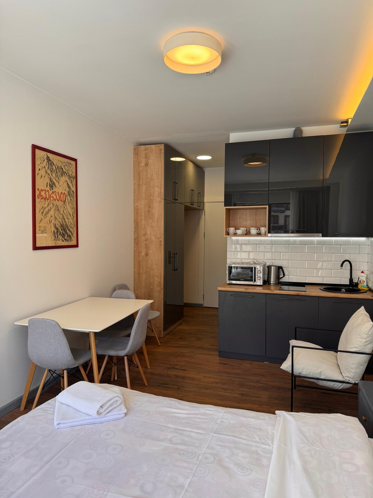 - Apartment is located in Gudauri few steps from ski area. -Apartment is cozy place, From the balcony you will see a beautiful view of mountains. -Apartment is perfect for small groups of friends, families and couples who love ski, mountains and beautiful nature! This modern studio features a kitchenette with all amenities , a flat-screen and a private bathroom with a shower. -Apartment has private Ski Depot -Appartment has one double bed and double sofa bed. -Self check-in ( Lockbox)