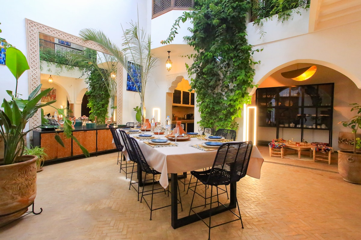 🕌 Maligayang pagdating sa Riad Carla — Ang Iyong Pribadong Oasis sa Marrakech Magugustuhan mo ang kagandahan, espasyo, at kalmado ng aming ganap na privatized na 6 na silid - tulugan na riad na nasa gitna ng Medina, malapit sa maraming lokasyon ng interes ng turista. Perpekto para sa mga pamilya, kaibigan, o group retreat, pinagsasama ng Riad Carla ang tunay na arkitekturang Moroccan sa mga modernong kaginhawaan at iniangkop na serbisyo, para lubos mong ma - enjoy ang iyong karanasan sa Marrakech — walang stress.
