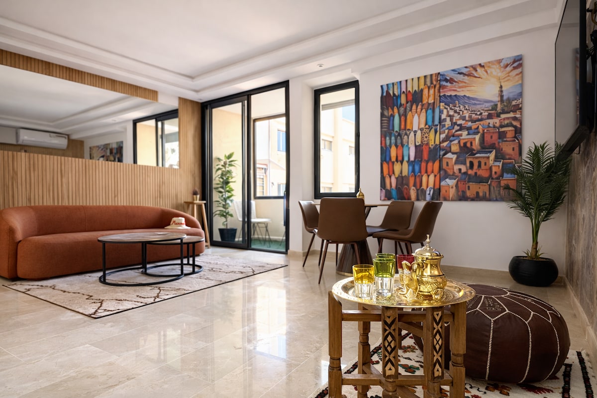 Gueliz, 2 minutong lakad mula sa istasyon ng tren, 5 minutong lakad mula sa Plaza, at iba pang mga tindahan. 2nd floor na may beep elevator at parking space Kuwarto na may queen - size bed, TV, imbakan, kaaya - ayang inayos na terrace, modernong banyong may Italian shower, kusinang may washing machine at semi - cross na sala na may TV na bumubuo sa apartment Fiber Optic, 4K Smart TV, IPTV, Netflix 2 nababaligtad na air conditioner (malamig at mainit) pinakabagong henerasyon Ligtas na tirahan 7/7 at 24/24 na may tagapag - alaga.