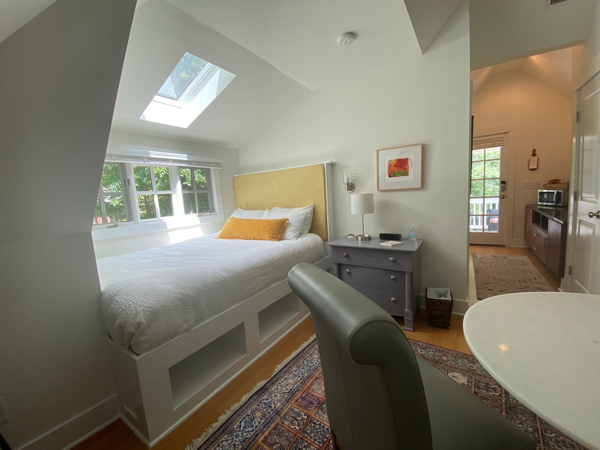 Maligayang pagdating sa Tranquility, isang studio apt. na may Tesla EV charging station. Ang aming komportableng (perpekto para sa 1 -2 bisita), ~300 sq ft well appointed studio ay matatagpuan sa itaas ng isang hiwalay na garahe (na may ultra tahimik na garage opener) w/hiwalay na pasukan sa parehong property bilang aming solong tahanan ng pamilya sa Old Irving Park sa Greensboro. Tangkilikin ang kumpletong privacy sa isang ligtas, tahimik, lugar na gawa sa kahoy at malapit pa rin sa mga restawran at pamimili. May sapat na paradahan sa driveway o sa kalye. Mainam din kami para sa mga alagang hayop!
