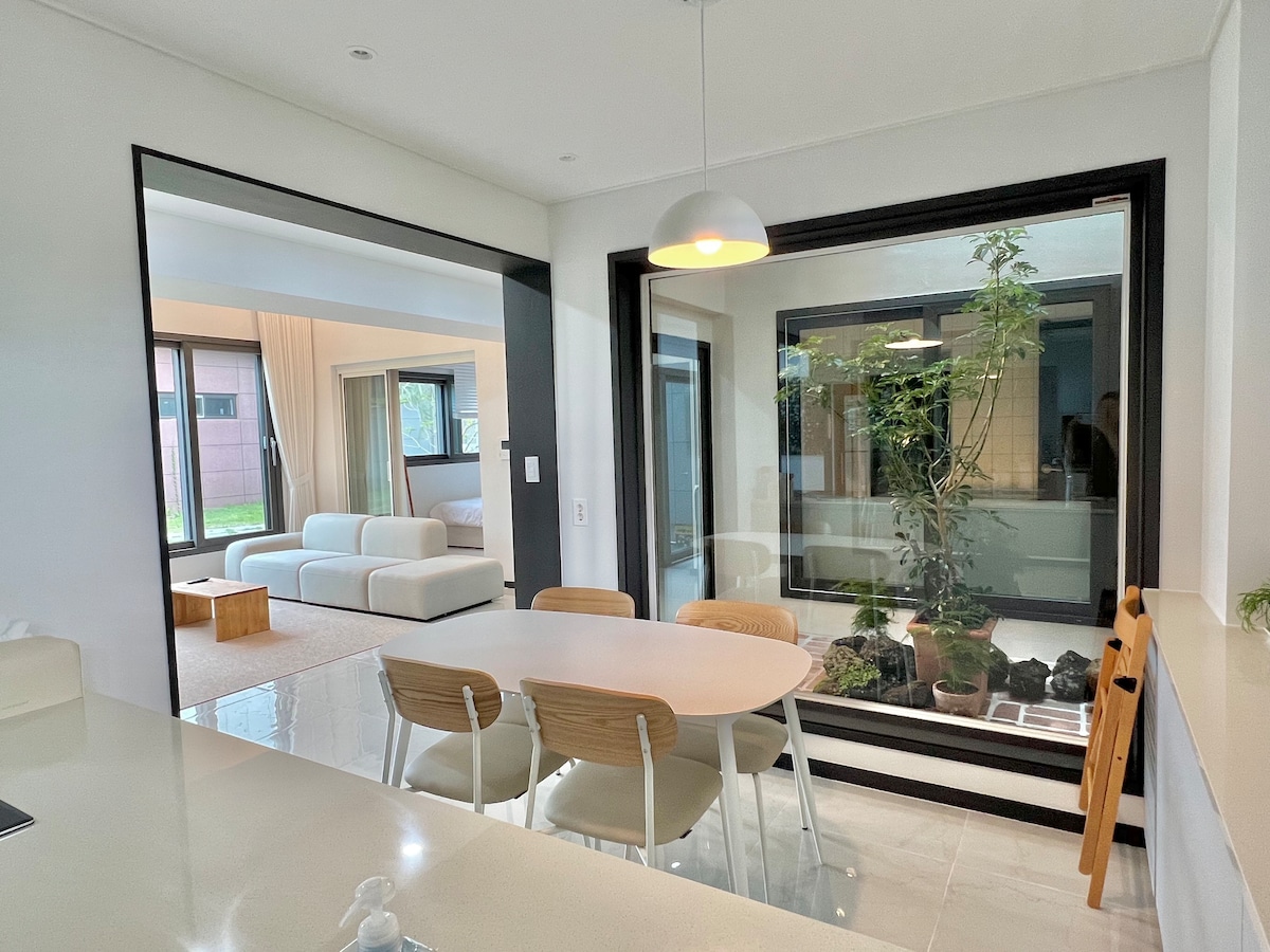 Para ☆ sa labas, gamitin ang parehong accommodation building at ang dalawang jacuzzi building. Para sa isang Linggo ay ipinanganak dahil gusto naming gawing komportableng lugar na matutuluyan ang aming tuluyan sa loob ng isang linggo. Sa halip na isang maikli at kagyat na biyahe, sana ay dahan - dahan mong maunawaan ang kanayunan ng Jeju at masiyahan sa sobrang tuwa ng Jeju nang kumportable at nakakarelaks, na parang sa dahilang may crush ang host sa Jeju. Huwag mag - tulad ng isang lokal sa isang liblib at tahimik na rural na nayon ng Jeju. Ang isang maliwanag na pribadong bahay at bakuran ay maaaring matunaw ang pagod na katawan sa pang - araw - araw na buhay. Ang tahimik na eskinita ay mahusay para sa isang nakakalibang na paglalakad, at mayroong isang coastal road sa loob ng 5 minutong biyahe, kaya makikita mo ang magandang dagat.