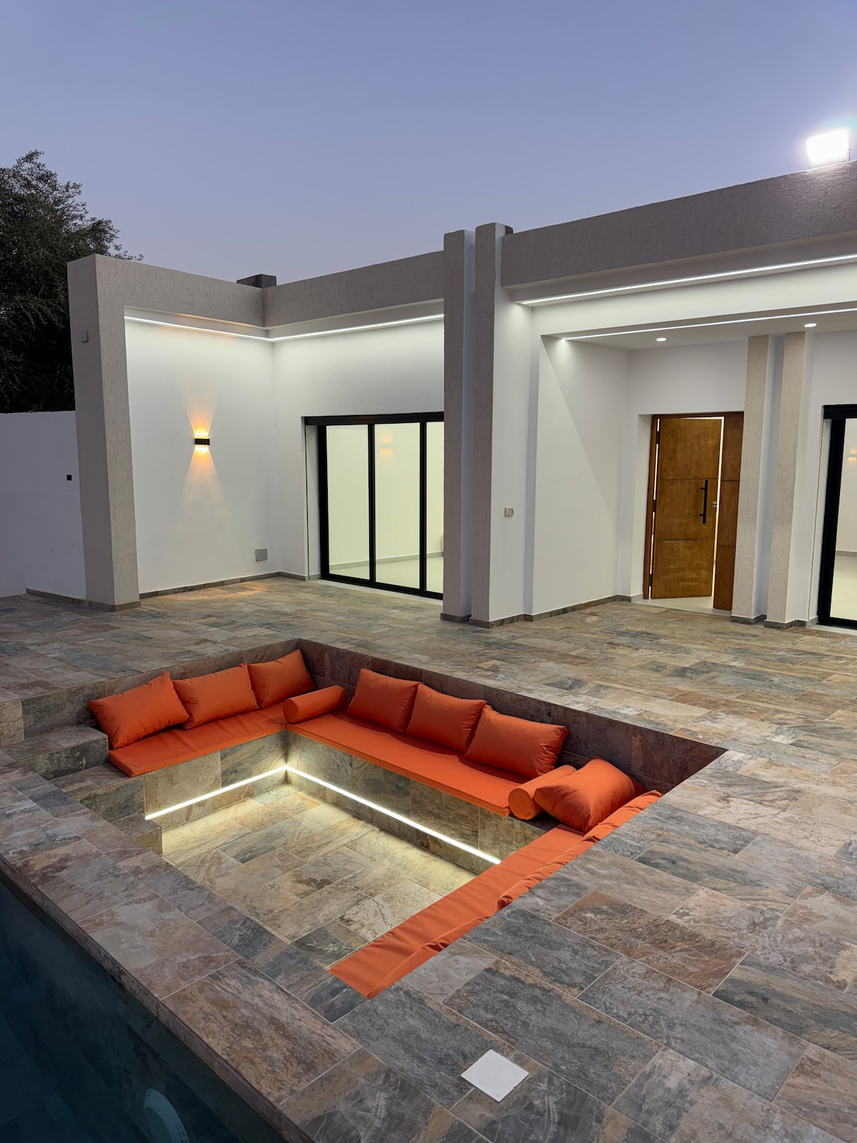 Mararangyang villa na matatagpuan sa isang chic at ligtas na pag - unlad, na napapalibutan ng mga puno ng olibo at puno ng palmera. Malapit ang villa sa lahat ng amenidad: 5km mula sa sentro ng Midoun, ilang minuto mula sa pinakamagagandang beach sa isla at malapit sa mga aktibidad ng turista. Modernong villa sa isang antas na may malinis na linya, ganap na naka - air condition na may malaking swimming pool. Layout na bukas sa labas na may mahusay na liwanag. Doon naghahari ang kalmado, katahimikan at kapakanan.