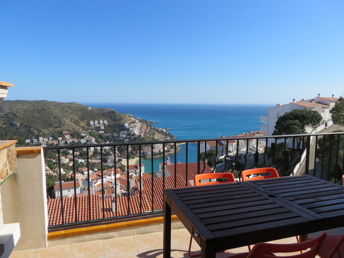 Apartment na may tanawin ng dagat na 50 metro mula sa magandang beach ng Almadrava sa Roses. Matatagpuan ang apartment sa unang palapag ng family residence na "Santa Maria", na may access sa tennis court. Komportableng apartment, nilagyan ng nababaligtad na air conditioning sa sala at kuwarto 1, dishwasher, washing machine, oven, microwave, vitro hob, refrigerator. Pribadong paradahan. Halika at magrelaks sa ingay ng mga alon, at tamasahin ang maaliwalas na terrace at lilim ng mga puno.