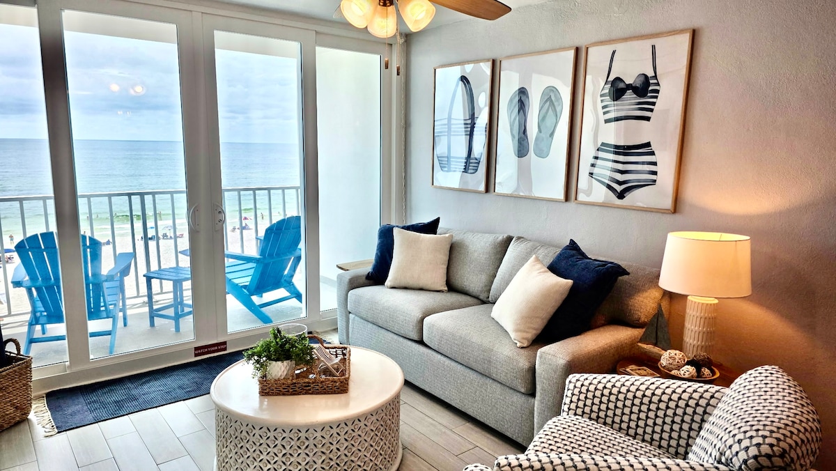 Kung saan nakakatugon ang mga nakamamanghang tanawin sa pangunahing lokasyon. Masiyahan sa: - Nakamamanghang pribadong balkonahe na may malawak na tanawin ng Golpo. - Lumabas sa iyong yunit at pumunta sa beach. - Kasama sa reserbasyon ang libreng paradahan (nagkakahalaga ng $30!). -1 King Bedroom + built - in na bunks + queen sofa bed. - Pribadong pool sa beach mismo. - Matatagpuan sa gitna ng Gulf Shores, may maigsing distansya papunta sa The Hangout at marami pang iba. - Bagong na - renovate na unit! - Itinatampok sa amin ng pagtatalaga na "Paborito ng Bisita" ang Nangungunang 5% ng lahat ng listing sa AirBnB!