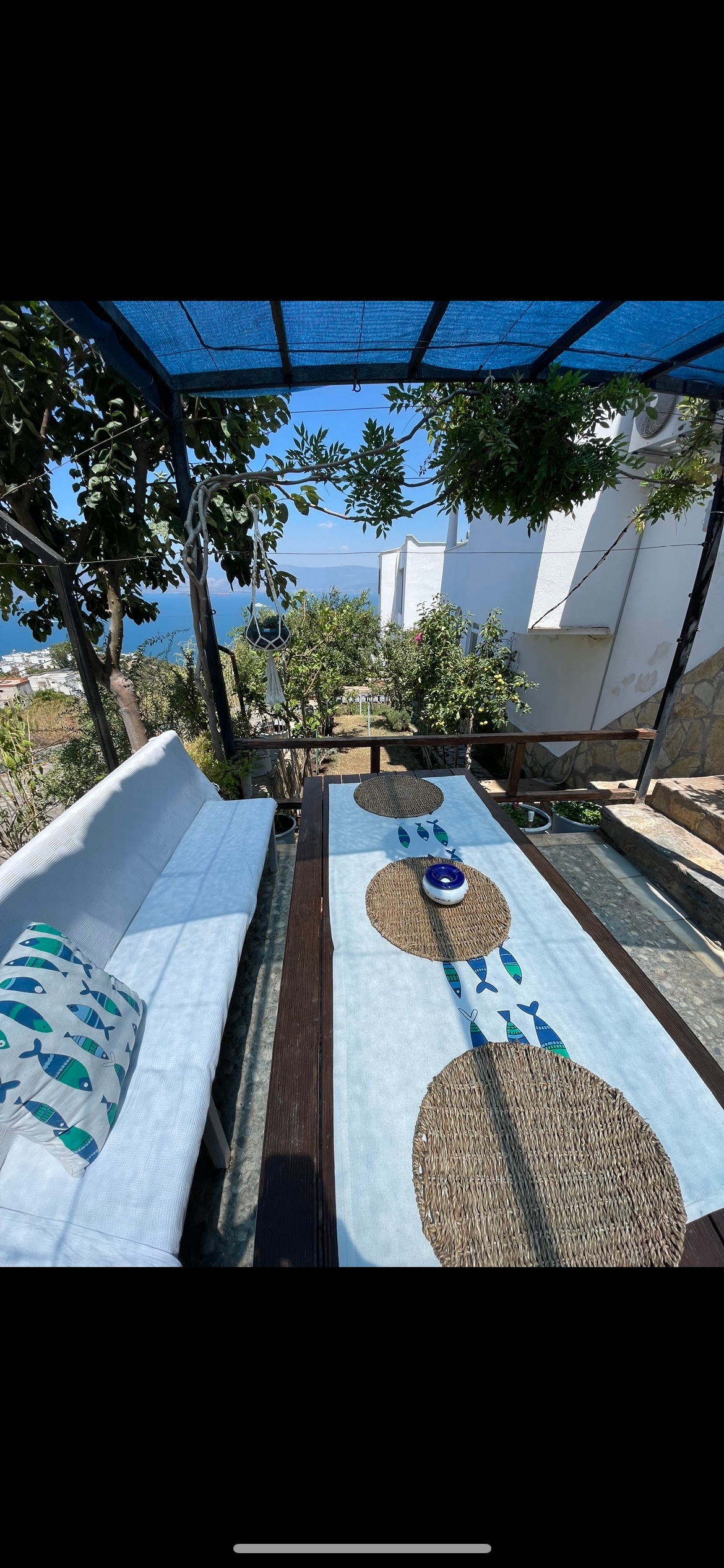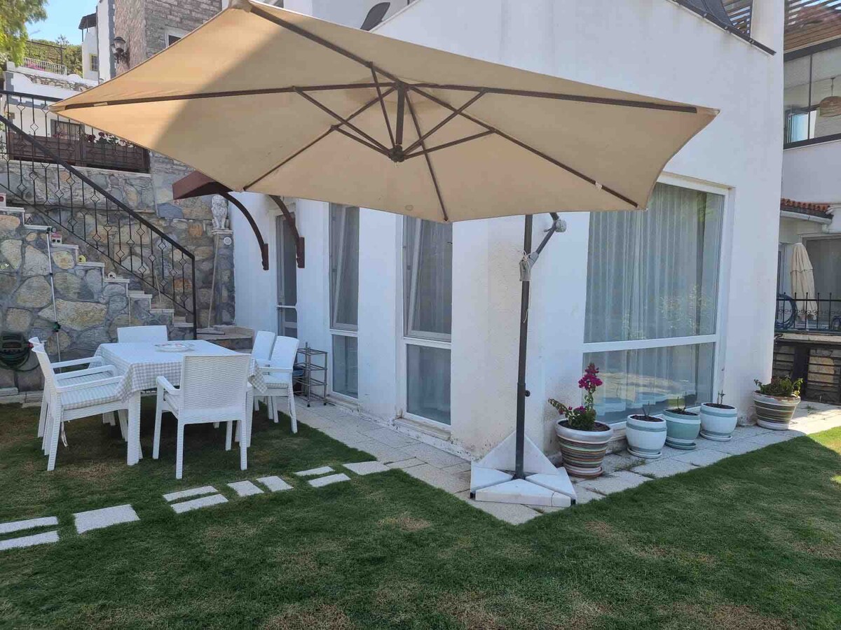 Bodrum Boğaziçi'nde ailenizle ve arkadaşlarınızla konaklayabileceğiniz, huzurlu, sakin, yemyeşil, siteye özel kullanabileceğiniz ücretsiz plajı olan şık bir ev. Plajda şezlong, şemsiye, duş ücretsizdir. Evin kendine ait giriş çıkış kapısı, bahçesi bulunmaktadır. Ev Bodrum - Milas Havaalanına araçla 15 dakika, Bodrum merkeze 30-35 dakika, sitenin plajına araçla 2 dakikadır. Araçla gelinmesi pazara, marketlere, plaja gidilmesi konusunda daha konforlu olacaktır. Plajda otopark bulunmaktadır.