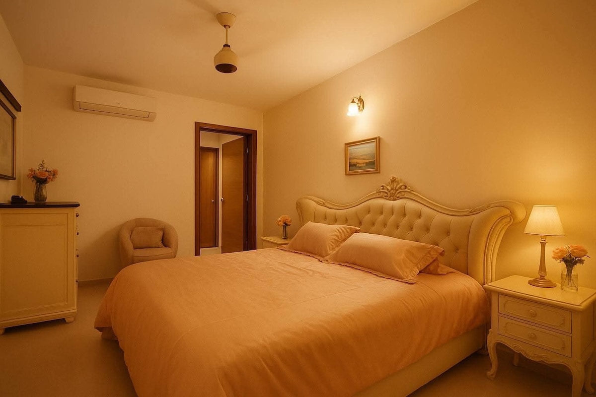 1680 sqft mararangyang 2 silid - tulugan Apt.all rooms are air conditioned and has spacious modern wall cabinets.Attached bathroom with hot shower. May kasamang balconie ang master suite at 9/7 ft Iniangkop na higaan kung saan puwedeng matulog ang 4 na tao. 2nd bedroom king size bed at nakatalagang lugar ng trabaho. Kumpletong kusina na may microwave at lahat ng bagong amenidad sa pagluluto at pagkain. Maluwang na naka - air condition na sala na may bagong sofa set kabilang ang queen sofa bed.Dining table na may 6 na upuan at Refrigerator.Servent Room na may Bath.