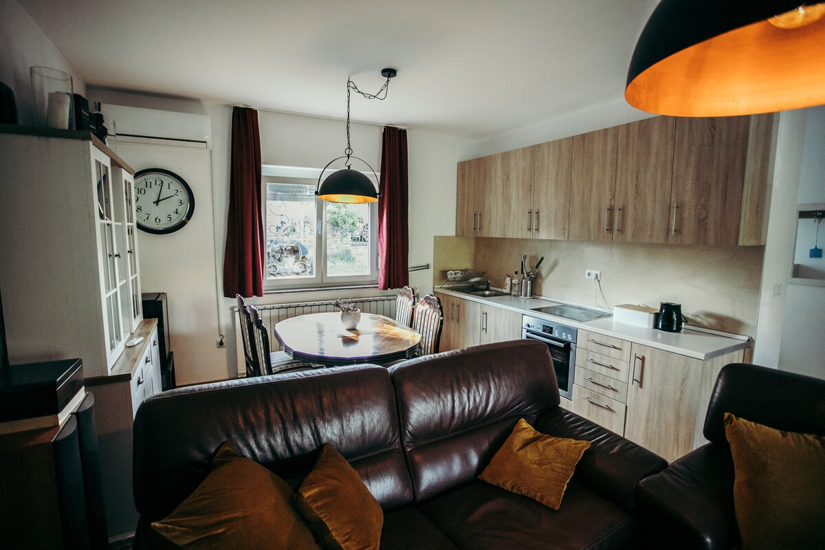Bagong dekorasyong semi - detached na bahay sa kanayunan sa tahimik na nayon ng Beravci. Mayroon kang pribadong paradahan at maluwang na bakuran na may maraming puno ng prutas at bulaklak. Sa loob ng bahay ay may halaman , maluwang na sala na may sofa bed (140x166) , kuwartong may 180x200cm na higaan , kusina na may lahat ng kailangan mo para sa isang nakakarelaks na bakasyon at banyo . Isang tunay na paraiso para makatakas mula sa mga tao sa lungsod at isang oras pa mula sa mga kultural na site.