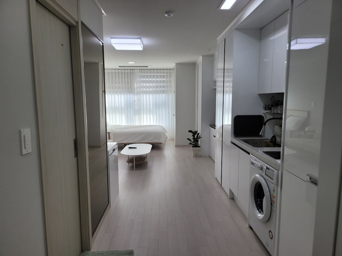 Isa itong kaaya - aya, maaliwalas, at kaaya - ayang tuluyan na may mala - bahay na kapaligiran na matatagpuan 3 minutong lakad mula sa likurang pintuan ng Gwangju KTX Songjeong Station. Bilang isang bagong gusali, ang lahat ng mga fixture at bedding ay malambot at bago. May paradahan (Makipag - ugnayan sa amin nang maaga at ipaparehistro ka namin nang libre) Hindi ibinibigay ang mga pampalasa sa mga amenidad.