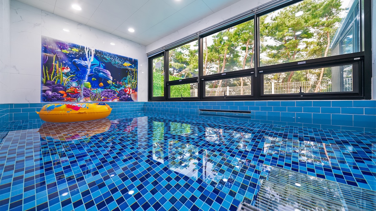 Matatagpuan sa Bomun, Gyeongju, Hwangnidan - gil, Bulguksa, Gyeongju World, atbp. Matatagpuan ito sa loob ng 20 minuto sa pamamagitan ng kotse mula sa iba 't ibang monumento, atraksyong panturista, at IC. Konektado sa kuwarto ang loft, pribadong bahay, pribadong bakuran, at pribadong barbecue area, at may malaking swimming pool sa loob, kaya magagamit mo ito 24 na oras. May zone para sa mga bata sa labas at cypress na jjimjilbang (ondol room), na ginagawang angkop na lugar na matutuluyan ng mga pamilya.
