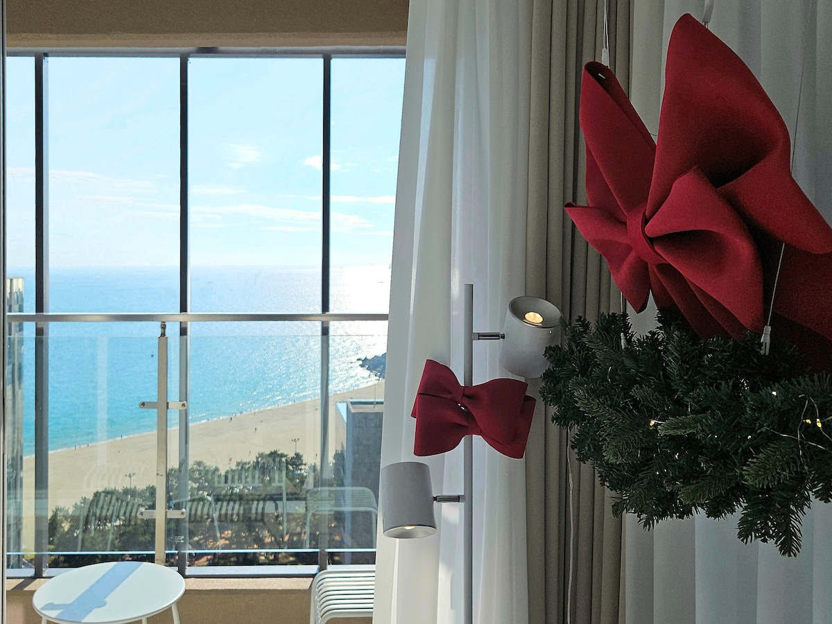 Sa harap ng dagat ng Haeundae, isang lugar kung saan bukas ang umaga na may tunog ng mga kalmadong alon. Magpahinga mula sa abalang ritmo ng pang - araw - araw na buhay, Tulad ng mabagal na dumadaloy na alon, maaari kang manatili sa sarili mong bilis Isa itong tahimik at malalim na lugar na pahingahan. Higit pa sa malawak na bukas na panoramic na window ng tanawin ng karagatan Masiyahan sa nagbabagong seascape sa paglipas ng panahon. Mula sa malambot na sikat ng araw sa umaga hanggang sa paglubog ng araw, at katahimikan ng dagat sa gabi - Sa pamamagitan lang ng pamamalagi, mararamdaman mong gumaan ang puso mo Magiging espesyal na karanasan ito. Sa dalawang nakakarelaks na terrace na nakaharap sa dagat, Masiyahan sa kape na may mainit na sikat ng araw sa umaga at alak na may dagat sa gabi. [Impormasyon sa tuluyan at lokasyon] 1 minutong lakad ang Haeundae Wave mula sa Haeundae Beach. Ang pinakamalapit na istasyon ng subway ay ang Haeundae Station, at kung lalabas ka mula sa Exit 7, maaari kang dumating nang komportable. Aabutin nang humigit - kumulang 8 -10 minuto sa paglalakad, at sa isang malinaw na araw, kahit na ang landas na iyon patungo sa dagat ay nagiging bahagi ng biyahe. 🌊🚶♀️