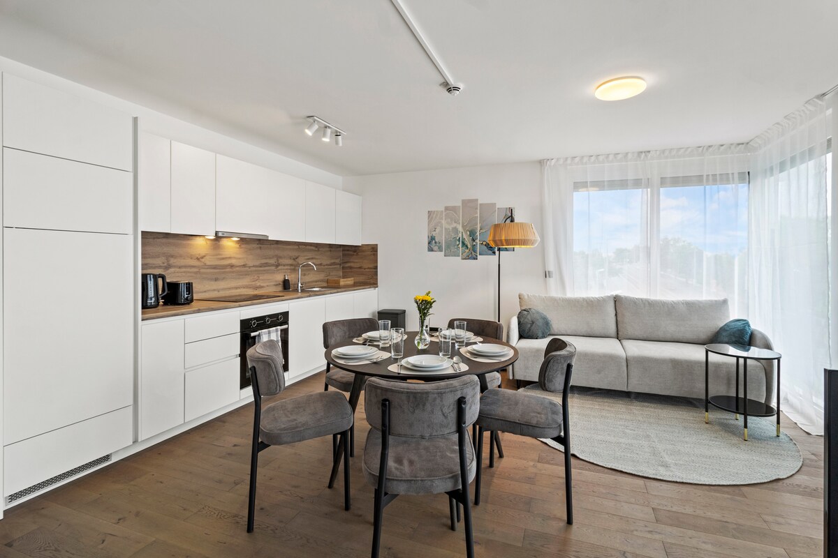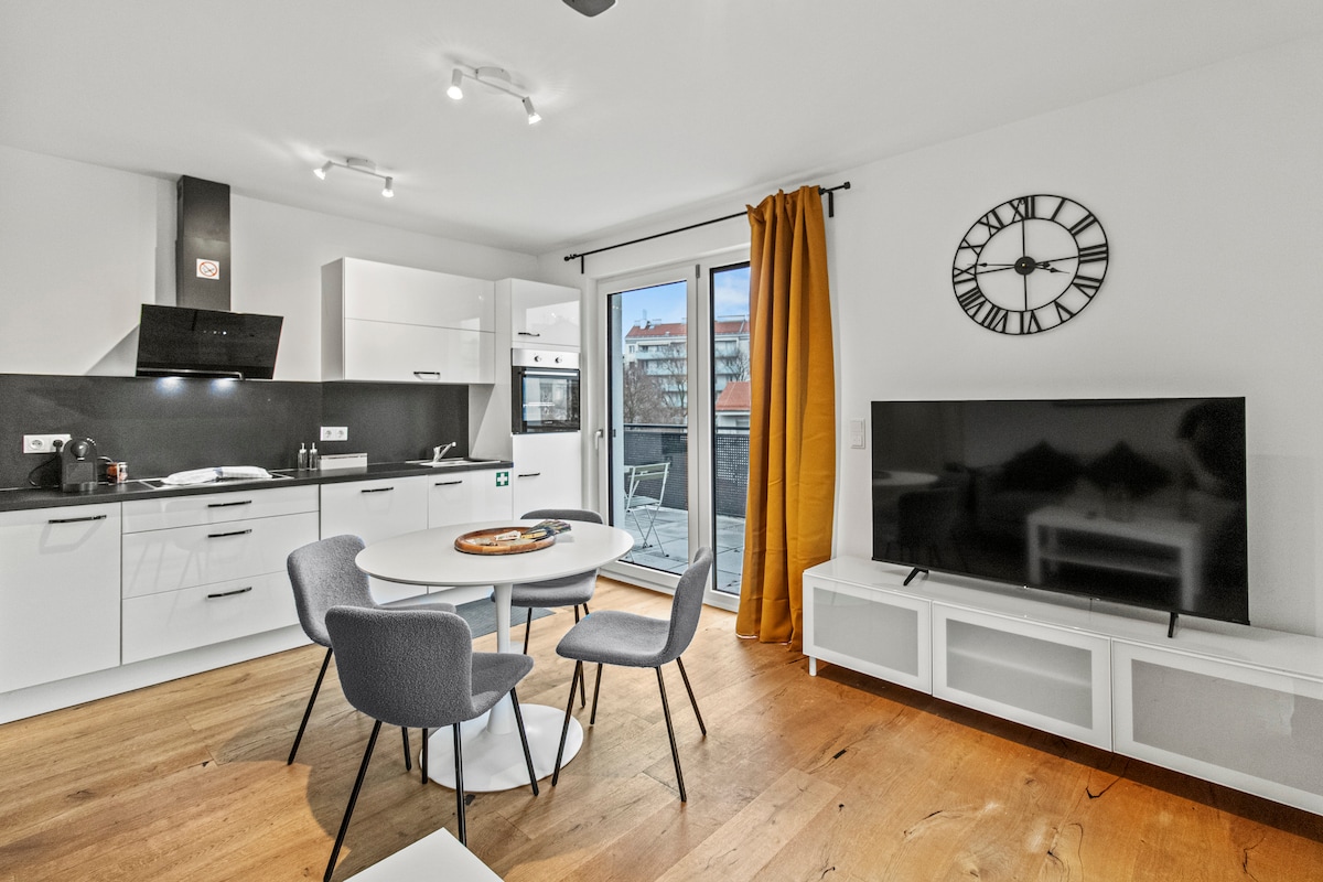 Isang lugar kung saan maganda ang pakiramdam—may magagandang detalye, komportableng muwebles, at maaraw na terrace kung saan puwedeng magrelaks. Pinagsasama ng maliwanag na bagong apartment na ito ang modernong disenyo at kaginhawaan. Magandang parke, malalaking bintana, hiwalay na kuwarto, maluwang na kusina at hiwalay na toilet. Iniimbitahan ka ng terrace kung saan matatanaw ang kanayunan na magrelaks. Tahimik na lokasyon, mahusay na koneksyon, 30 minuto sa sentro. May smart TV, Wi‑Fi, at bentilador. Perpekto para sa mga biyahe sa lungsod, business trip, gabi ng konsyerto at marami pang iba!